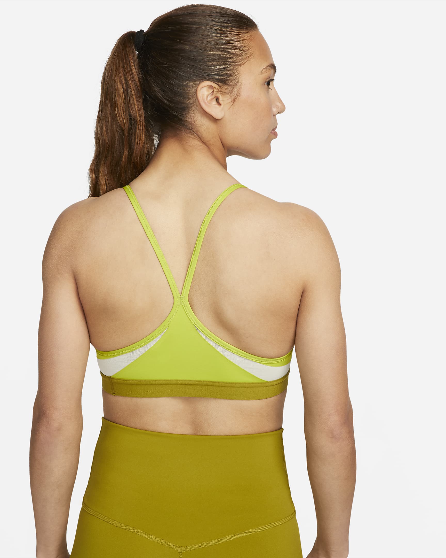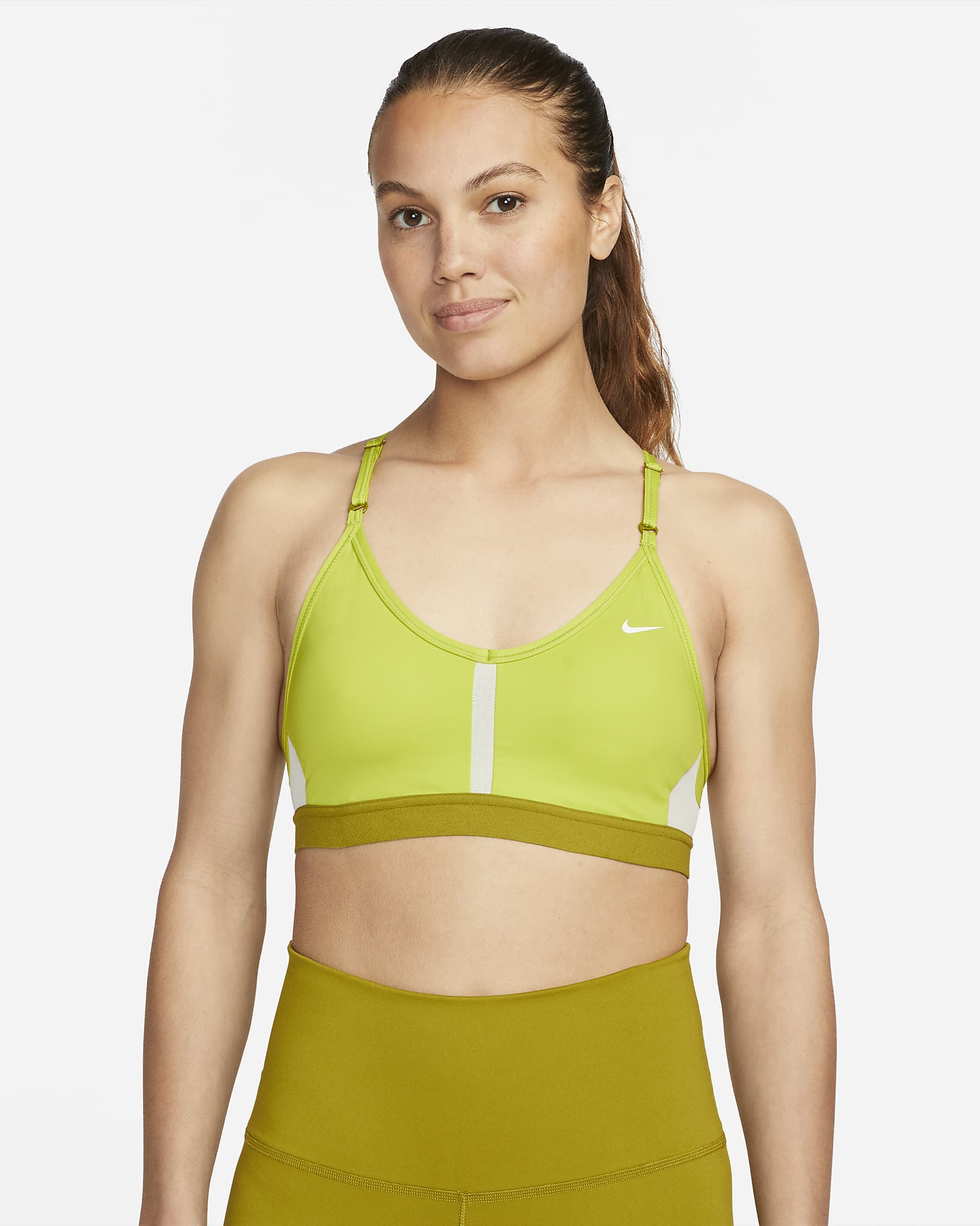 The Nike Dri-FIT Indy Sports Bra makes simple support even easier with straps that adjust at the front. Soft fabric is designed for breathability on the front and back in case you work up a sweat. With easily removable pads and bonded flat seams, it's effortlessly comfortable. This product is made from at least 50% recycled polyester fibres.